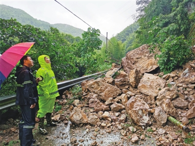 浙江省地球物理地球化学勘查院地灾防治专家在余姚市鹿亭乡岙里村乡道边坡崩塌点进行应急调查。沈旭伟 摄
