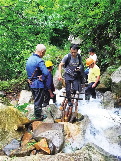 安徽省级地灾防治专家徒步赶赴绩溪县荆州乡地灾隐患点调查。徐生平 摄