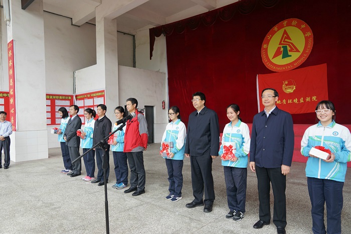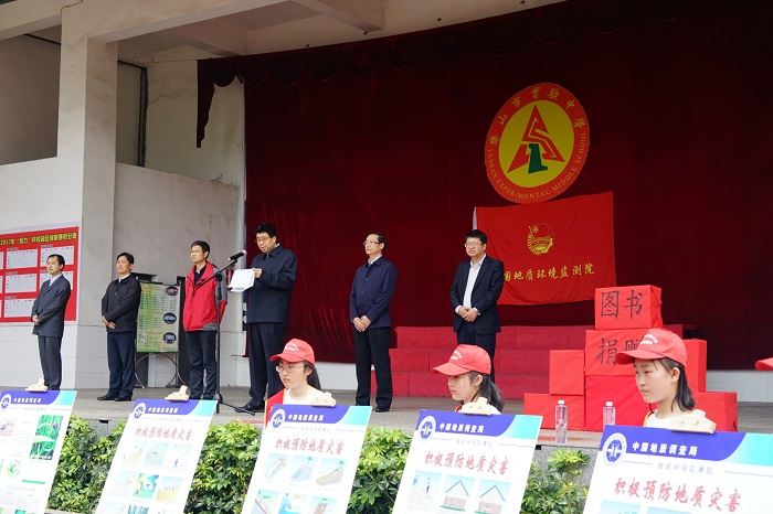 在乐山市副秘书长张松林的主持下,中国地质环境监测院党委书记李文鹏,国土资源部地质环境司副司长胡杰,四川省地质矿产勘查开发局总工程师李树,乐山市副市长罗新礼、中国地质调查局直属机关党委副书记李帮、中央国家机关精神文明建设协调领导小组干部赵凌波向乐山市实验中学赠送了地质科普图书。