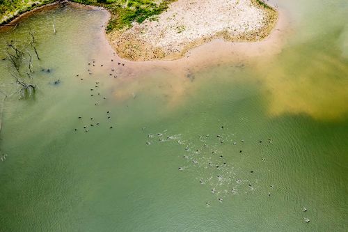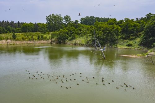 图为李埝林场内,成群的野鸭在湖面划水嬉戏。? ?