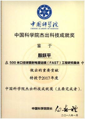 ? ? 据悉,中国科学院杰出科技成就奖授予院属单位在近五年内完成或显示影响的重大成果的个人或集体,每两年评选一次,每次授奖总数不超过10个。获奖者由中国科学院院长签署奖励证书并颁发奖章或奖杯。殷跃平为“500米口径球面射电望远镜(FAST)工程研究集体”中唯一的中国科学院院外获奖专家。