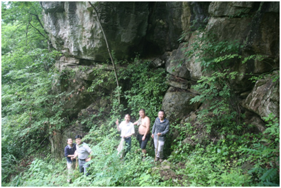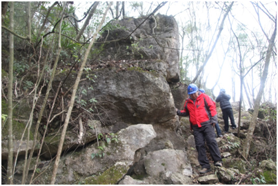照片3?南仁东研究员(右一)与地质专家一起在大窝凼洼地查勘大型松动岩体