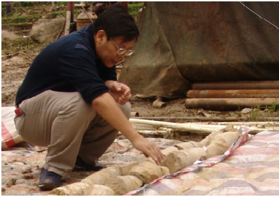 照片2?殷跃平在大窝凼洼地现场察看钻孔岩心