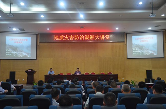 ??? 会后,“地质灾害防治湖湘大讲堂”第一讲开讲,由殷跃平作“山区城镇化地质灾害问题研究”专题讲座,尹学朗全程主持讲座。(彭小云/文??萧欣/编辑)