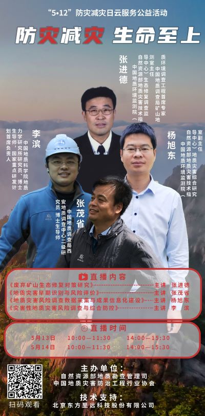 ?? 由自然资源部地质勘查管理司、中国地质灾害防治工程行业协会联合举办的“5.12”防灾减灾日云服务公益活动已正式启动。5月13日、14日,每天10:00—11:30、14:00—15:30,由中国地质环境监测院(自然资源部地质灾害技术指导中心)生态修复调查监测室主任、中国地质调查局矿山地质环境调查工程首席专家张进德主讲《废弃矿山生态修复对策研究》;中国地质环境监测院(自然资源部地质灾害技术指导中心)地质灾害综合研究室副主任杨旭东主讲《地质灾害风险调查数据采集与成果信息化建设》;中国地质调查局西安地质调查中心二级研究员、博士生导师张茂省主讲《地质灾害早期识别与风险评价》;中国地质科学院地质力学研究所研究员、博士生导师,国家重点研发计划首席负责人李滨主讲《灾害性地质灾害风险调查与综合防控》。热烈欢迎广大会员单位和社会各界准时扫码观看。