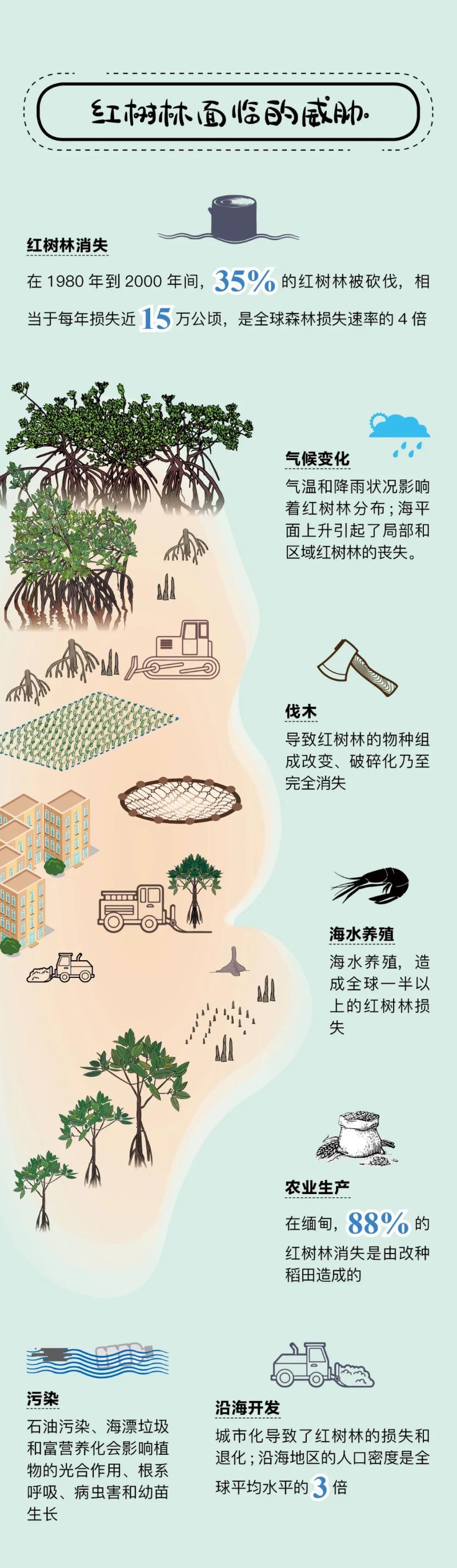 ? ?红树林是地球上最脆弱的生态系统之一。特殊的地理位置让它们承受着陆地和海洋的双重压力,潮汐让它们极度开放,也极易受伤。任何污染与砍伐都可能破坏它们尽力维持的生态环境和生物多样性。