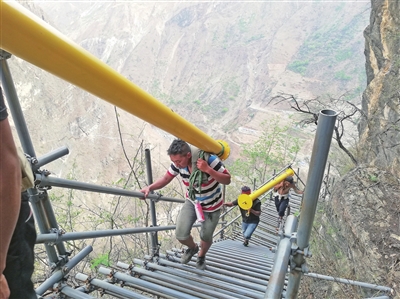 垂直高差近千米,2600多级钢梯台阶,往返一次需要五六个小时,负责项目建设的中国地质调查局探矿工艺研究所高级工程师王佃明如数家珍?!白钅训木褪前沧安牧系陌嵩?,因为没有路可以抵达,所有的材料都必须靠人工搬运。为了方便人力搬运,我们还做过一些改进,比如安装GNSS的钢管,一般都有5到6米长,我们就想办法把它改成为两段,搬上山后再用法兰连接,但长度也有2到3米。还有一些设备比较重,得几个人一起接力才能抬到山上去,上‘天梯’就非常辛苦,也很不安全。像工程建设中最常见的袋装水泥,购买一袋的价格也到不了50元,可是把它搬上山,光搬运费就高达400元,即使是生活在阿土列尔村两个壮劳力一天也只能靠接力才能扛一袋上山。以往实施的工程中,运输费用都不到工程总费用的5%,在这个项目中却是这个比例的好几倍甚至十几倍。”