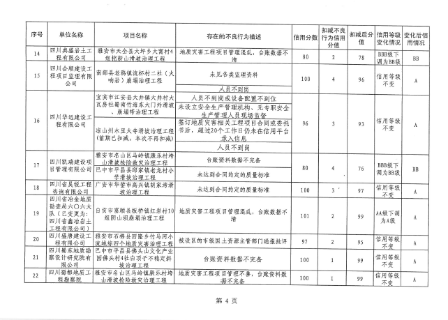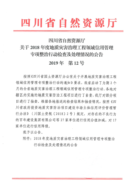 四川省自然资源厅关于2018年度地质灾害治理工程领域信用管理专项整治行动检查及处理情况的公告