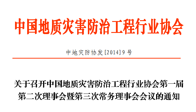 根据《中国地质灾害防治工程行业协会章程》的规定,经研究,定于2014年3月31日在北京召开中国地质灾害防治工程行业协会(以下简称“协会”)第一届第二次理事会暨第三次常务理事会会议,具体安排如下: