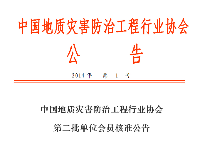 根据《中国地质灾害防治工程行业协会章程》、《中国地质灾害防治工程行业协会会员管理办法》,经审核,下列单位具备入会条件并经协会一届二次理事会批准成为协会会员(名单附后),现予公告。