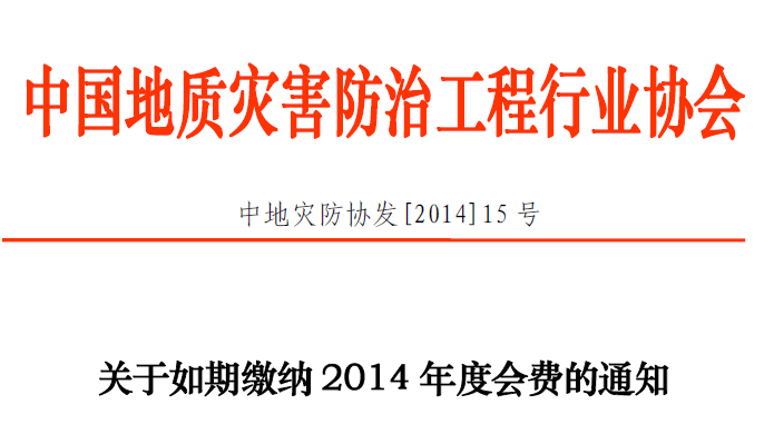 中国地质灾害防治工程行业协会(以下简称“协会”)秉持全心全意为会员服务的理念,2013年度协会各项工作全面开展,非常感谢各会员单位在过去的一年里对协会工作的支持。为更好地为会员服务,保障协会工作的正常运行,请各会员单位及时缴纳2014年度会费,具体事宜通知如下: