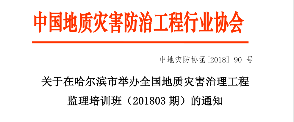 为提升地质灾害治理工程监理从业人员的业务素质,推动地质灾害治理工作水平的提高,由中国地质灾害防治工程行业协会(以下简称“协会”)主办、黑龙江省九0四环境工程勘察设计院承办的全国地质灾害治理工程监理培训班(201803期)将在黑龙江省哈尔滨市举办。有关事项通知如下: